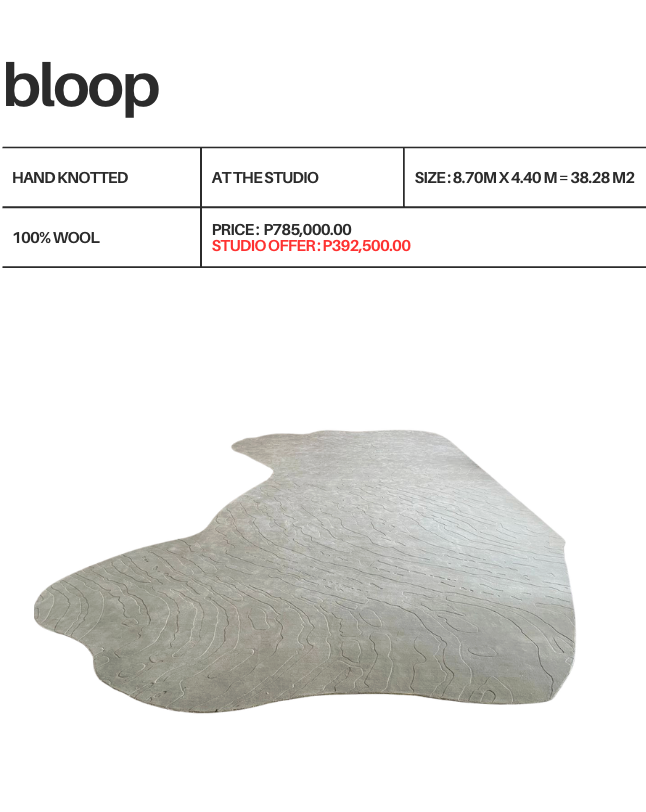 Bloop is a bold, modern rug with an irregular organic shape that instantly transforms any space. Designed to make a statement, its oversized form adds fluidity and character to living rooms, lobbies, or creative spaces. Handcrafted with precision and made to order, Bloop brings softness, style, and a touch of playful sophistication to any interior.